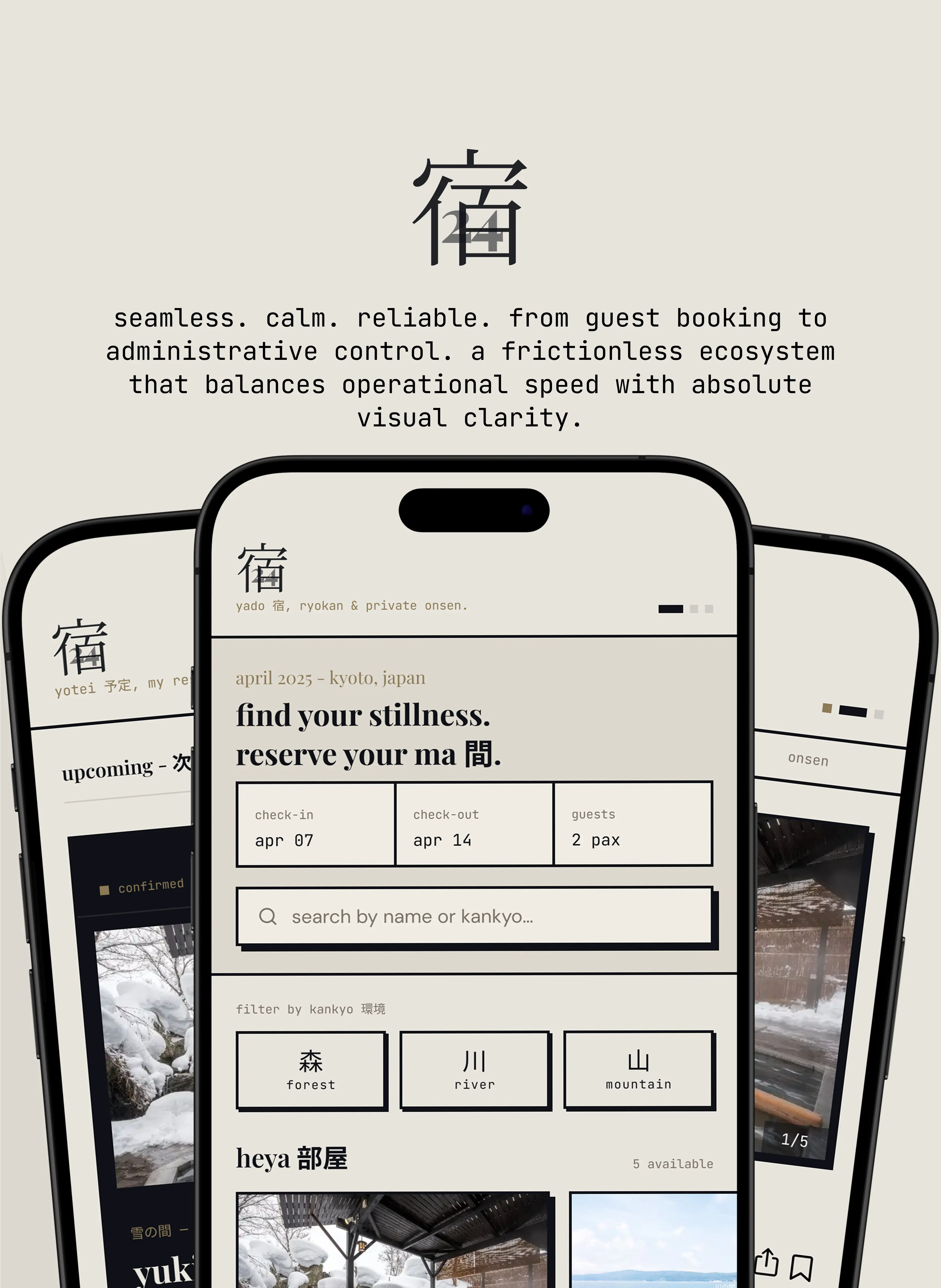 The solution is a cross-platform booking engine designed to handle the high-precision operations of luxury Ryokans. By applying a reductive UI strategy, the interface eliminates irrelevant data points to focus on the conversion of high-value services, such as private onsen sessions. The architecture replaces standard, cluttered booking patterns with a proprietary visual hierarchy that minimizes cognitive load for both guests and staff, ensuring that the digital transition is as seamless as the physical hospitality itself.